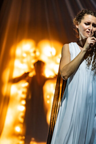 Darüber hinaus untersucht die Aufführung auch das politische Potential der Stimme und bezieht sich dabei sowohl auf die Proteste in Belarus im Jahr 2020 als auch auf den aktuellen russisch-ukrainischen Krieg. Die Performance möchte Barrieren durchbrechen und ein Bewusstsein für die Vielfalt der Kommunikation schaffen. Dabei wird nicht nur die »Stimme« betrachtet, sondern auch die Bedeutung der Stille. In der Aufführung arbeitet InterAKT eng mit der gehörlosen Performerin Sabine Scherbel zusammen. Die Performance folgt einer faszinierenden Reise, bei der die griechische Göttin der Stille, Harpokrates, im Mittelpunkt steht. Die Sängerin Viktoriia Vitrenko agiert als Echo bzw. Schattenfigur.